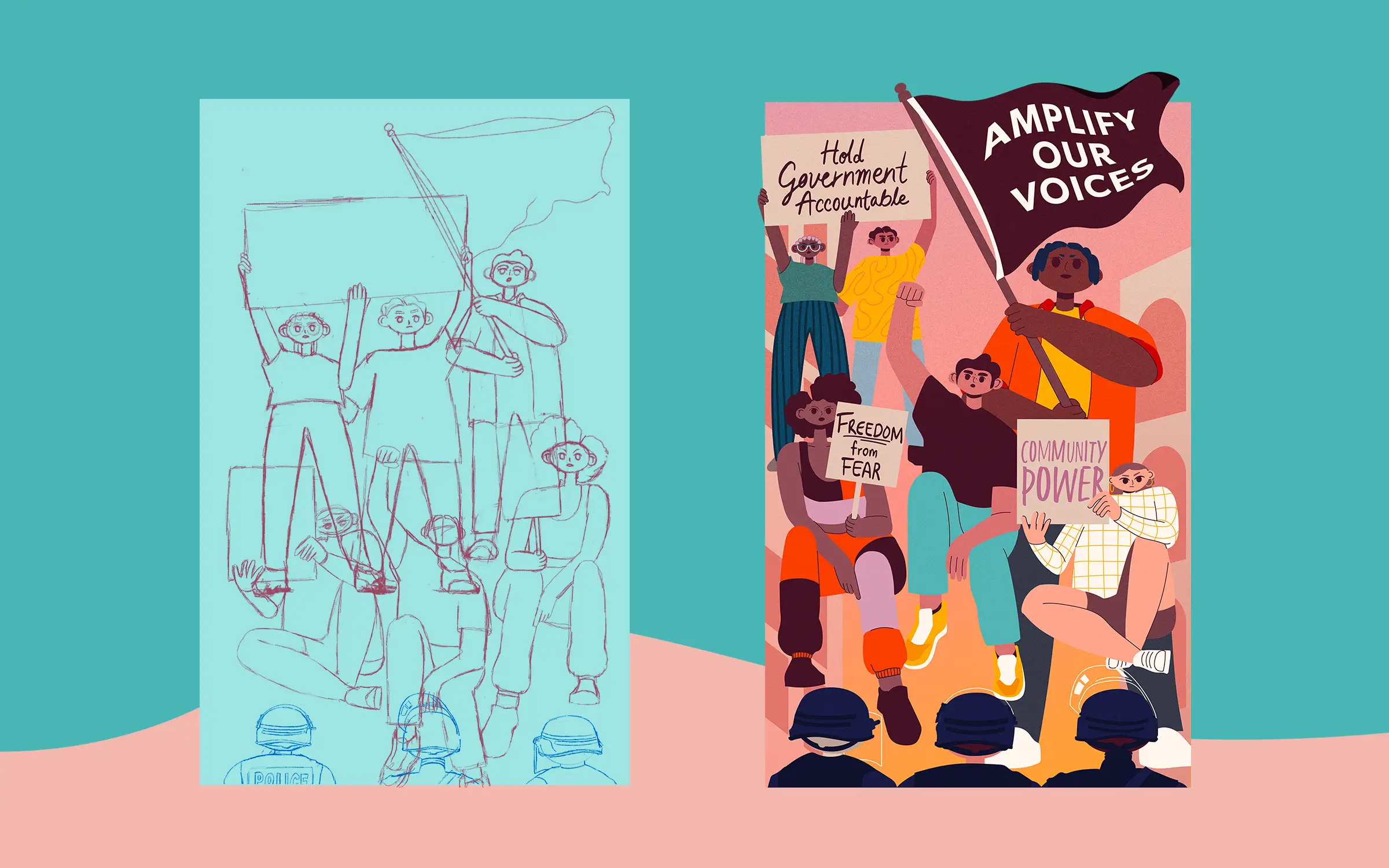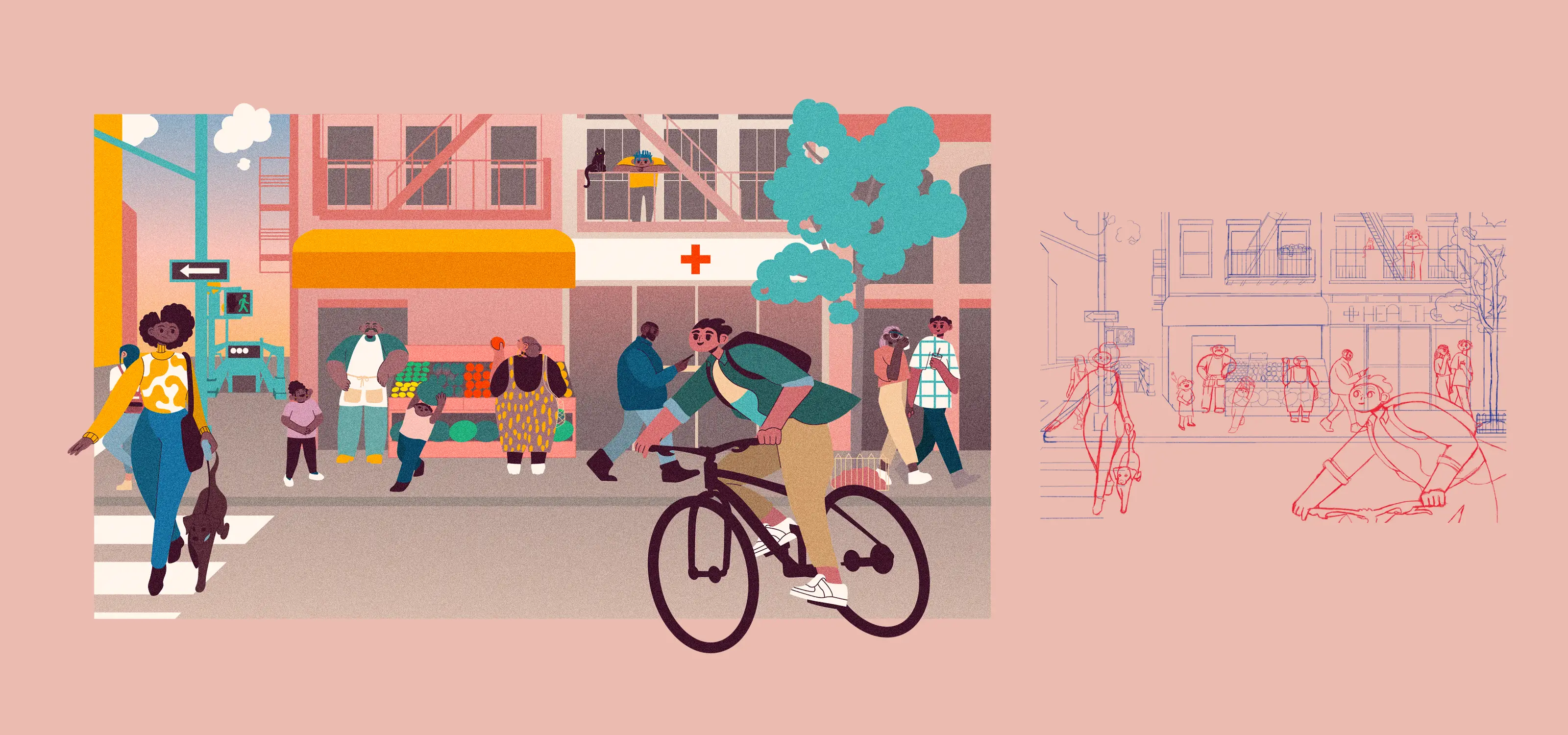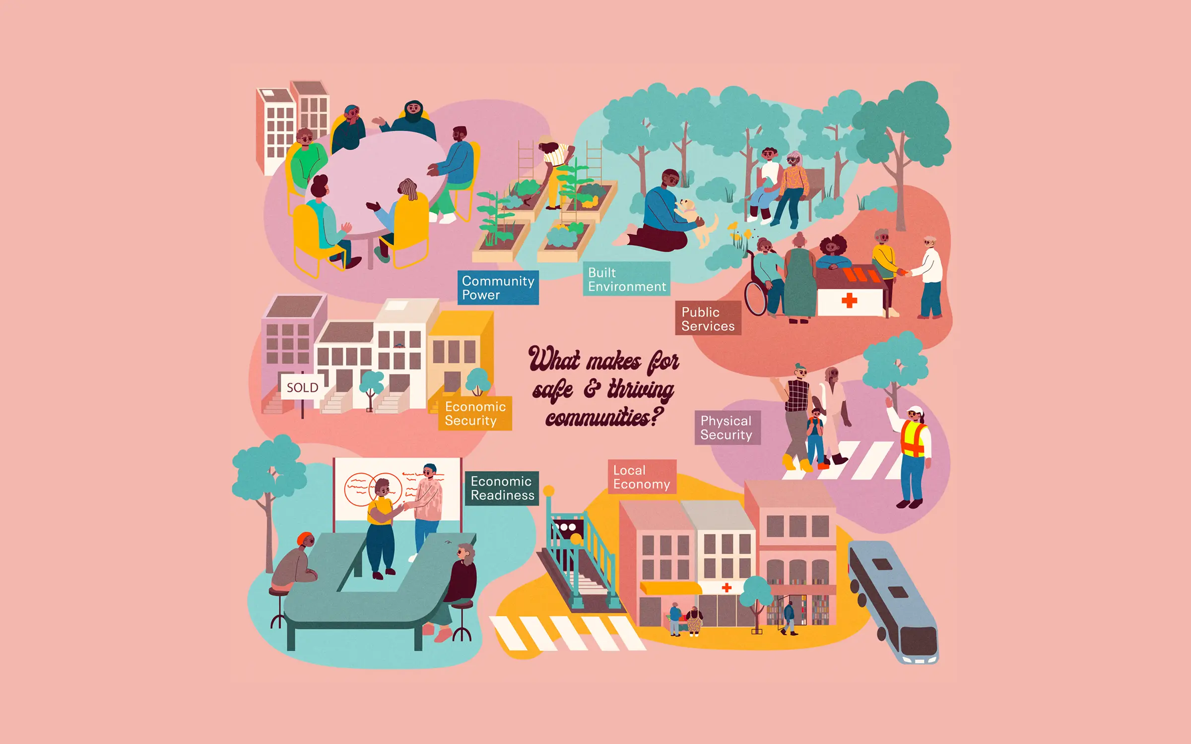 The client's web report was in search of approachable, fun, and inclusive illustrations to go alongside the study. NIS talked to individuals specifically in black and brown neighborhoods. What was the consensus? Residents shared that safety means so much more than crime. In collaboration with Odd Research Group, I was tasked to create engaging illustrations that represented and brought this data to life—taking special care to create characters of all shapes.